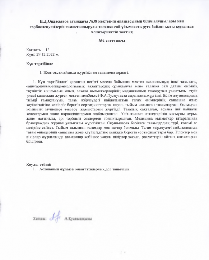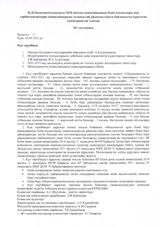Сапа мониторингі 2022-2023 оқу жылы. Мониторингтік комиссияның хаттамалары » Шымкент қаласының білім басқармасының «Н.Оңдасынов атындағы №38 мектеп-гимназиясы» шаруашылық жүргізу құқығындағы мемлекеттік коммуналдық кәсіпорны