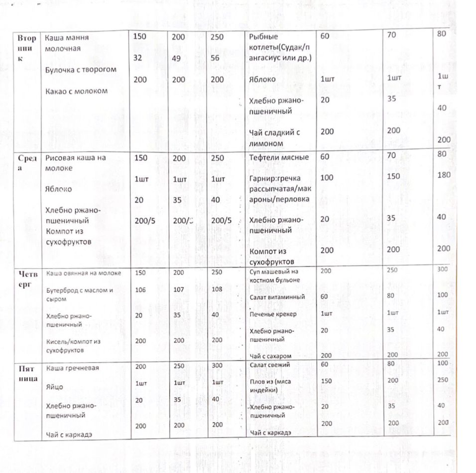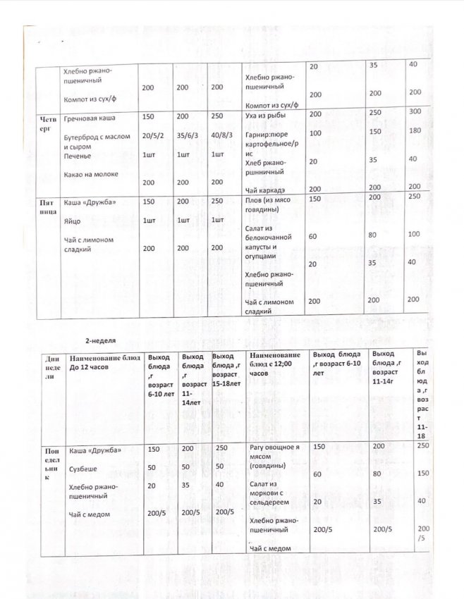 2024 жылға арналған Шымкент қаласының жалпы орта білім беру ұйымдарында оқушылардың тамақтануын ұйымдастыруға арналған 2 апталық «қыс-көктем» маусымдық тағам мәзірі бойынша берілген тағам