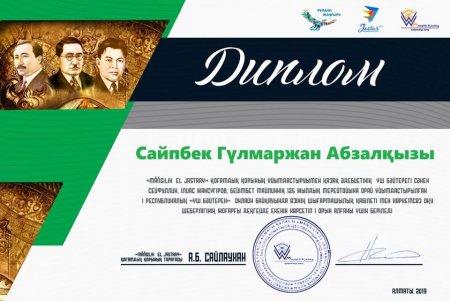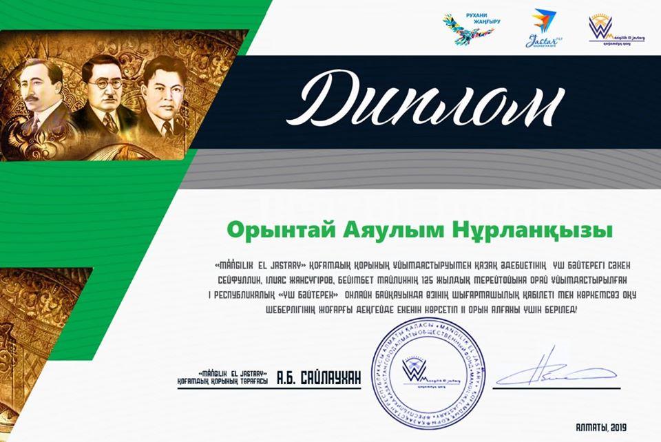 2 орын - Асетуллаева Гүлім (5 "З") - жетекшісі Шотаева Гульжан Нагашбековна, Орынтай Аяулым (9 "Г") - жетекшісі Пайзова Күлжамал Ескерқызы