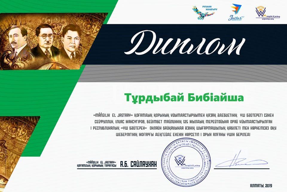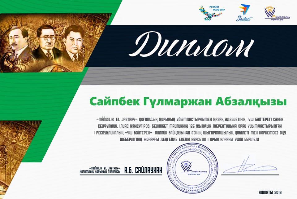 "Мәңгілік Ел жастары"қоғамдық қорының ұйымдастыруымен қазақ әдебиетінің үш бәйтерегі Сәкен Сейфуллин, Ілияс Жансүгіров, Бейімбет Майлиннің 125 жылдық мерейтойына орай ұйымдастырылған 1 Республикалық "Үш бәйтерек" онлайн байқауында өзінің шығармашылық қабілеті мен көркемсөз оқу шеберлігінің жоғарғы деңгейде екенін көрсетіп, Шымкент қаласының білім басқармасына қарасты Н.Оңдасынов атындағы №38 мектеп-гимназиясының оқушылары 1 орын алғаны үшін Дипломмен марапатталды: Сайпбек Гүлмаржан (10 "Б") - жетекшісі Ералиева Дариха Есжановна; Тұрдыбай Бибіайша (5 "З") - жетекшісі Шотаева Гульжан Нагашбековна