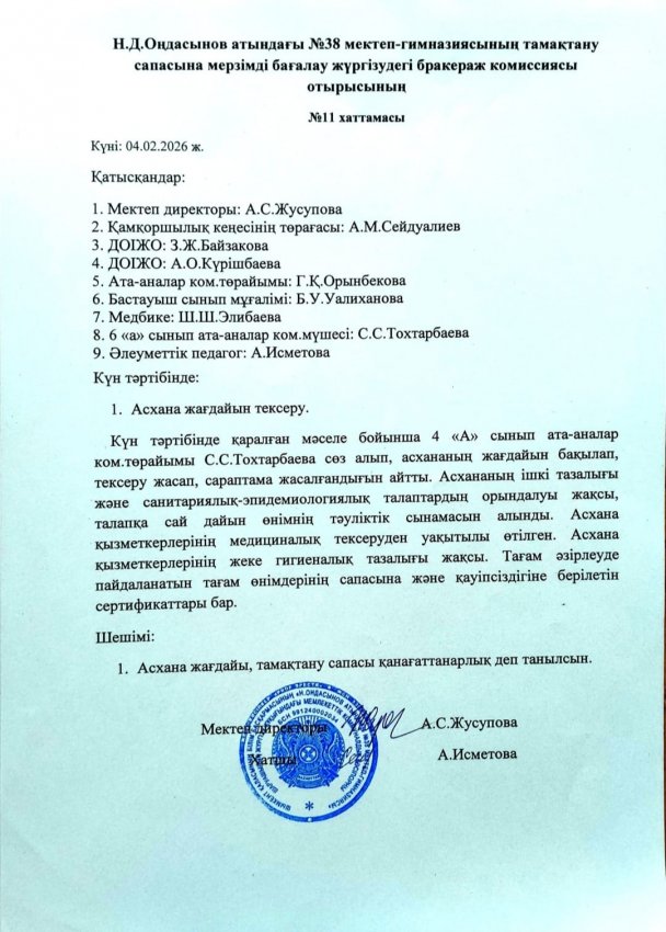04 февраль 2026 0 1 2 3 4 5 Н.Д.Оңдасынов атындағы №38 мектеп-гимназиясының тамақтану сапасына мерзімді бағалау жүргізудегі бракераж комиссиясы отырысының хаттамасы мен асхананы тексеру актісі
