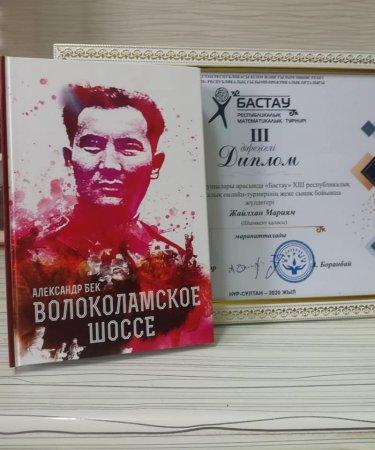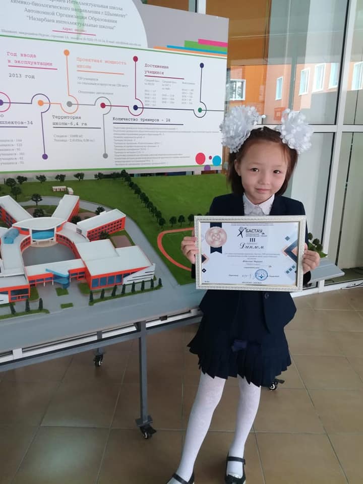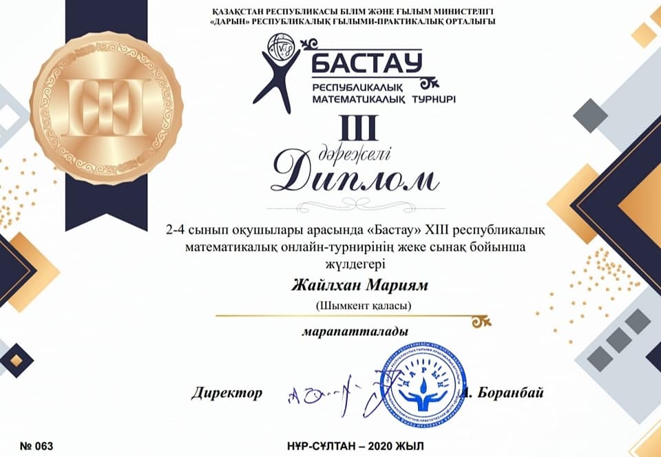Ученица 4"Д" класса школы-гимназии #38 имени Нуртаса Ондасынова города Шымкент  Жайлхан Мариям завоевала ІІІ призовое место в ХІІІ Республиканском математическом турнире "Бастау", организованном научно-практическим центром "Дарын" при министерстве образования и науки Республики Казахстан. Классный руководитель: Хаитова Галина Алексеевна.