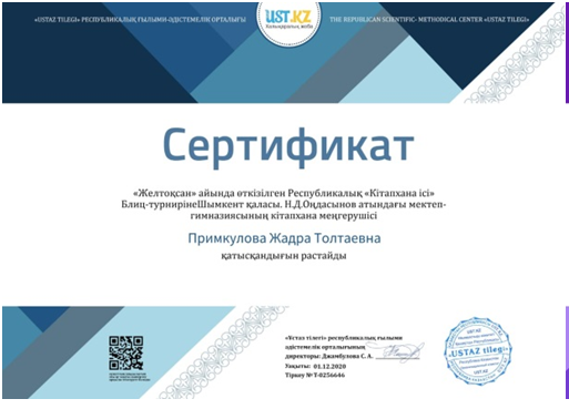 2020жыл. «USTAZ TILEGI» Респулбликалық ғылыми әдістемелік орталығы ұйымдастырған «Желтоқсан» айында өткізілген Республикалық «Кітапхана ісі» Блиц – турниріне қатысқаны үшін Сертификат табысталды.